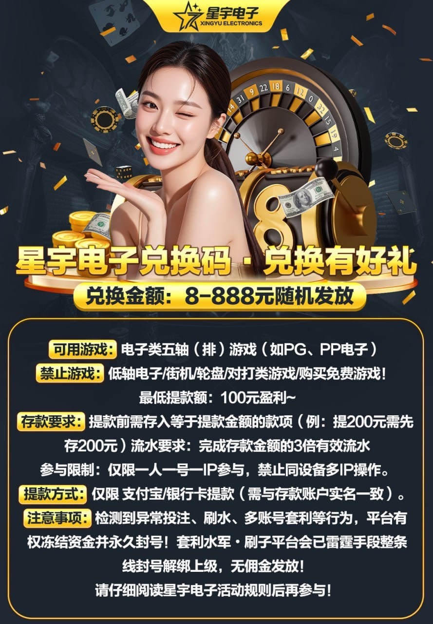 注册送8-888元,绑定手机号码,提款方式才可以领取。只能娱乐WG/PG电子,盈利后充值100提现。领取方式:绑定对应资料后,点击论坛左上方三条横杆,找到彩金商城选择相应的平台用论坛金币兑换平台券码,得到券码后在到游戏平台兑换。(星宇兑换入口在优惠--新人--特邀8-888元)