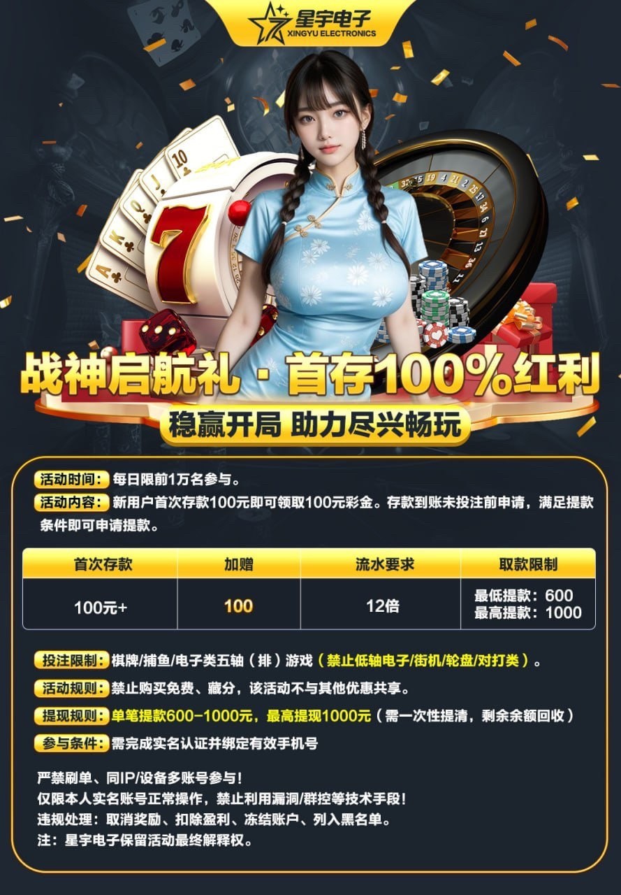 100+100流水要求10倍流水,最低提款600,最高1000,本彩15倍流水。仅限投注低轴电子,具体规则看下图