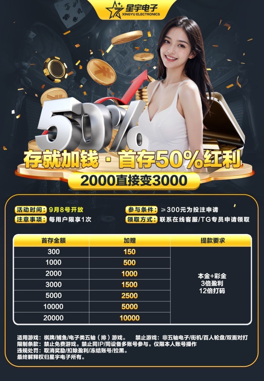 首存加赠50%,300+150,500+250,1000+500,3000+1500,5000+2500,10000+5000,要求本彩5倍盈利10倍流水起提,仅限投注五轴电子,禁止购买免费,具体规则看下图